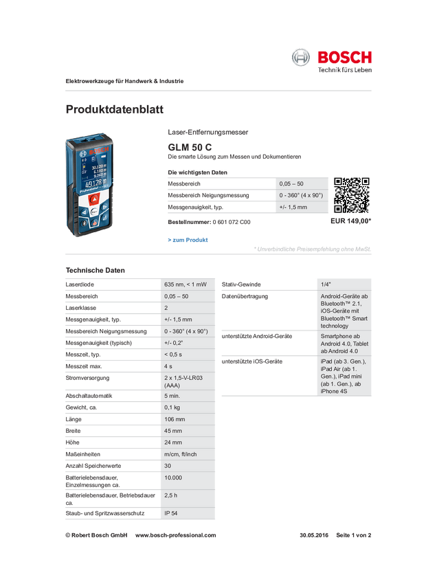 Bosch Professional GLM 50 C Dalmierz laserowy Adapter do statywu 6,3 mm (1/4 ") Maksymalny pomiar 50 m