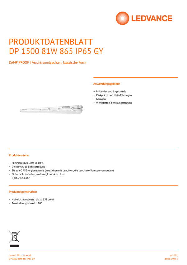 LEDVANCE Damp Proof Lampa LED do wilgotnych pomieszczeń LED LED wbudowany na stałe 81 W zimna biel, białe światło dzienn