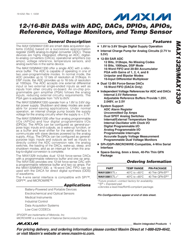 MAX1329 12-/16-Bit DAS with ADC, DACs, DPIOs, APIOs, Reference, Voltage Monitors, and Temp Sensor
