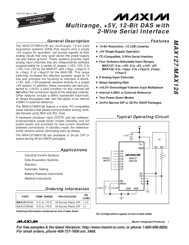 MAX127, MAX127A, MAX127B, MAX128, MAX128A, MAX128B Multirange, +5V, 12-Bit DAS with 2-Wire Serial Interface