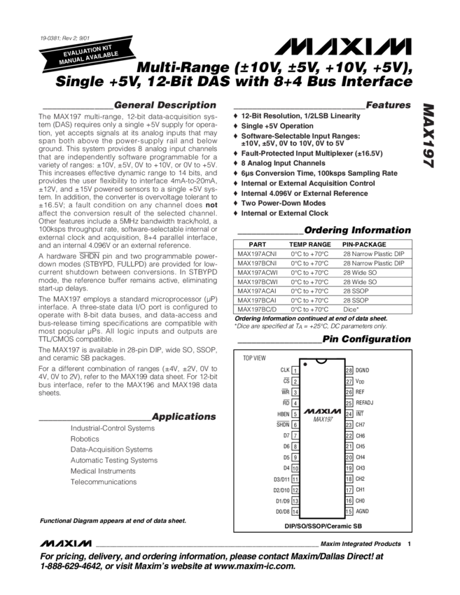 MAX197 8-Channel, Multi-Range, 5V, 12-bit DAS with 8+4 Bus Interface and Fault Protection