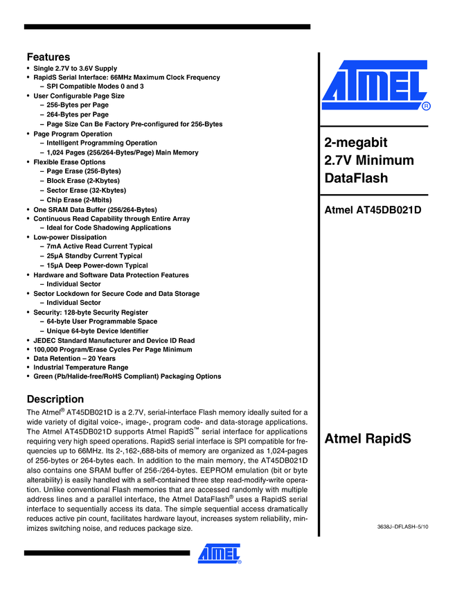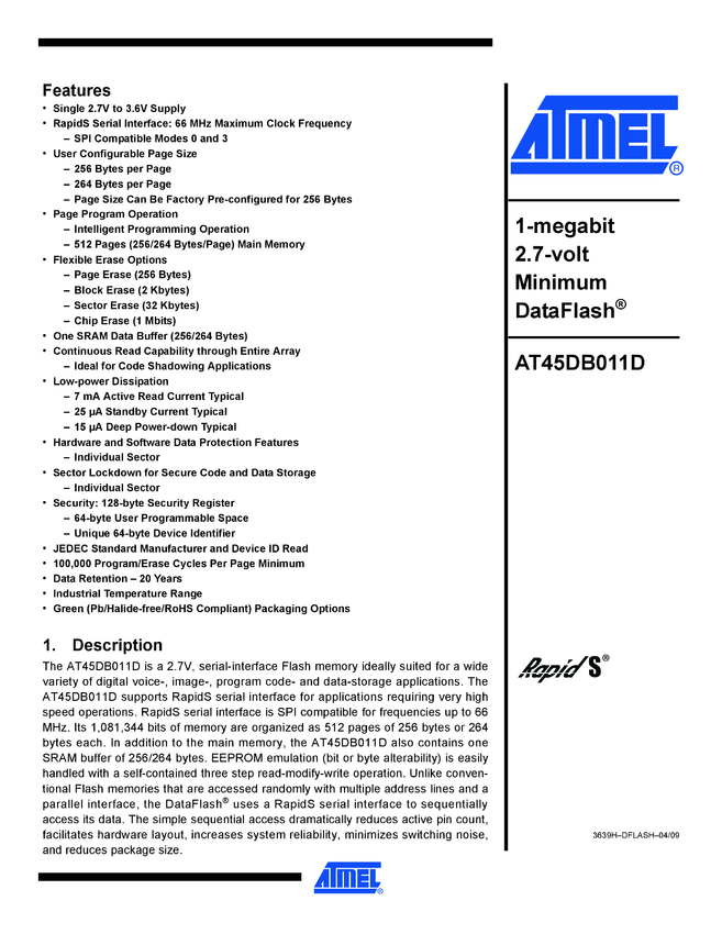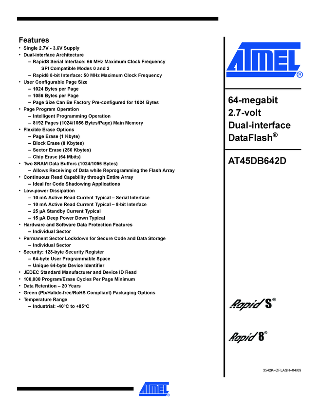 64-Mbit 2.7V Minimum Dual-Interface DataFlash Memory