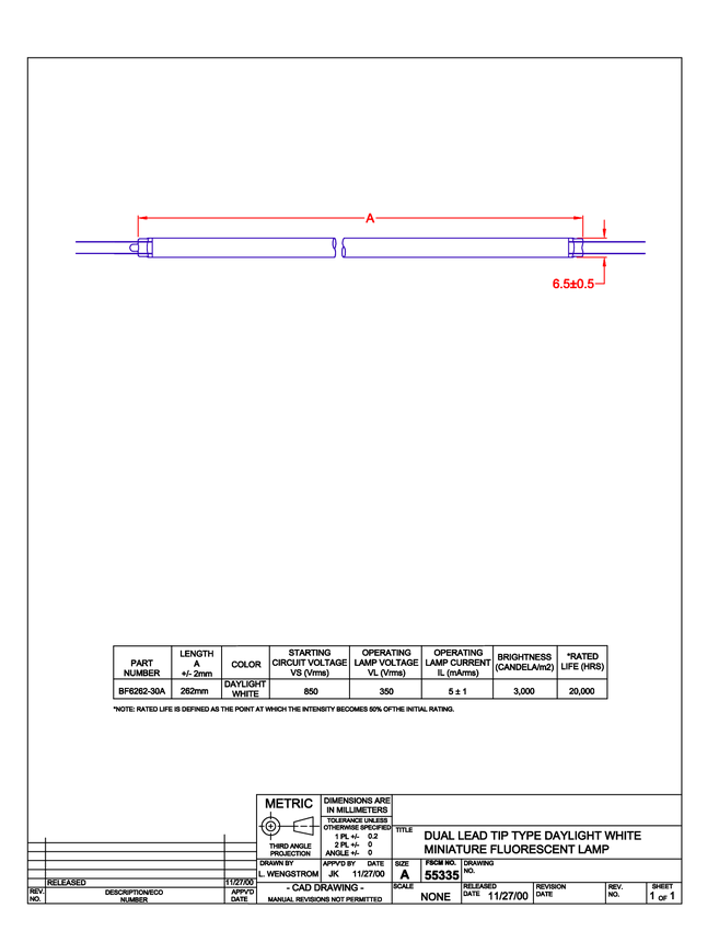 Lampa CCFL; Daylight White średnica 5,6 mm ; długość 262mm; start.volt. 850 V; zasilanie lampy 350 V; prąd 5 mA; jasność 6,500 Cd./m2 Temperatura barwowa 8400K (5100 K - 5716 K)