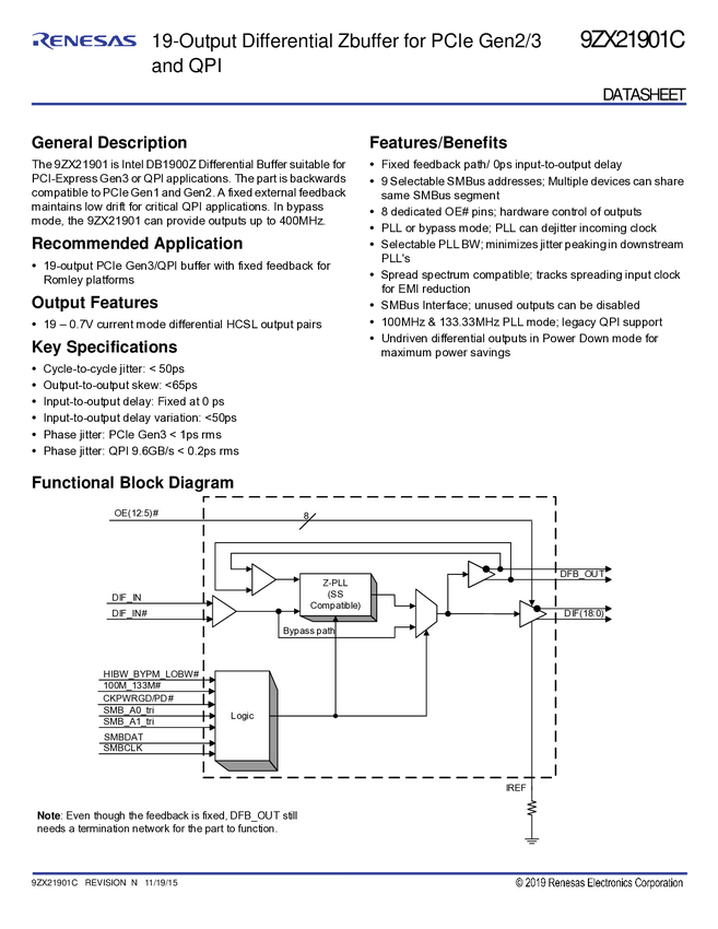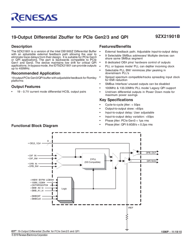 19-Output DB1900ZL PCIe Zero-Delay/Fanout Clock Buffer