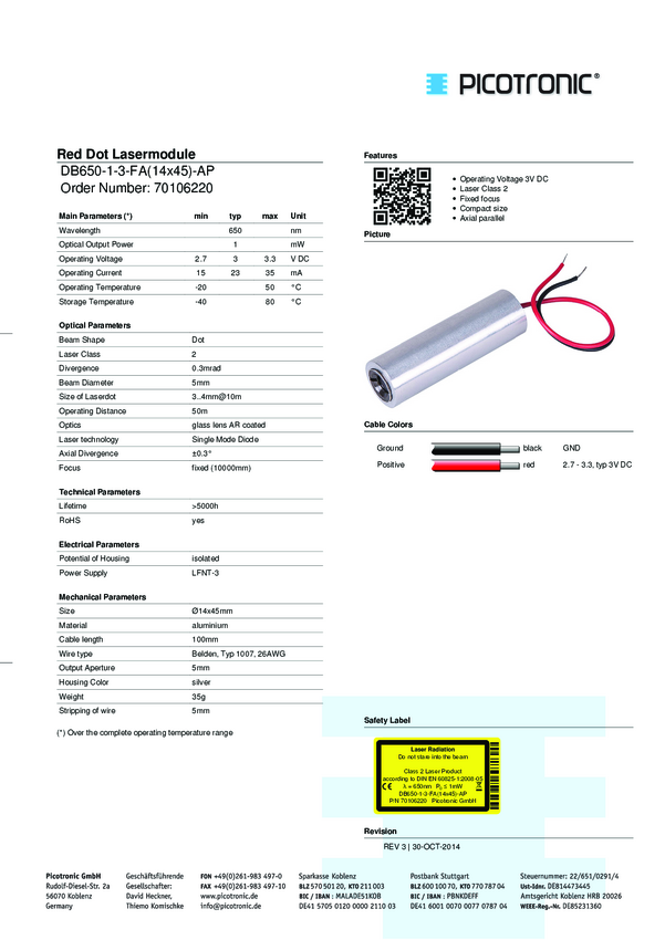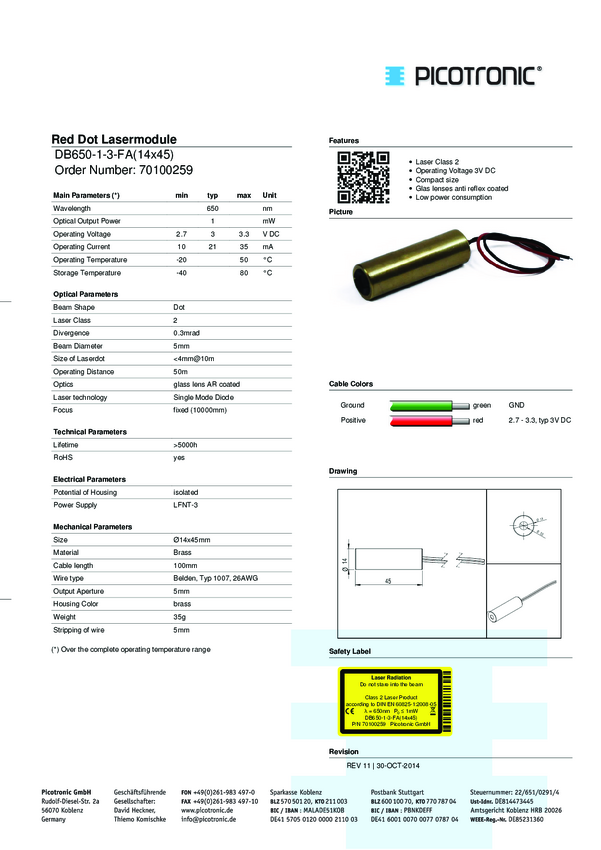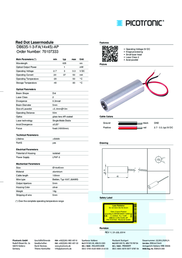 Picotronic 70106664 Moduł laserowy DB635-1-3-FA(14x45)-F7000, klasa 2, 1 mW, 635 nm