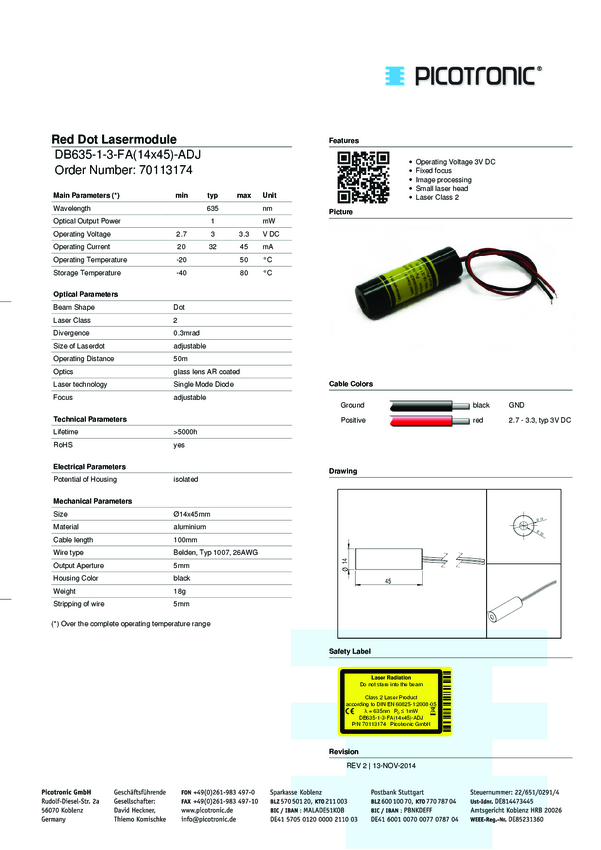 Picotronic 70113174 Moduł laserowy DB635-1-3-FA(14x45)-ADJ, klasa 2, 1 mW, 635 nm