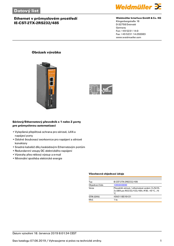Weidmüller konwerter seryjny / ethernet, 2x RJ45, 1x DB9 do RS-232, 1x blok zaciskowy do RS-422/485, IP 30, -40 °C...+75