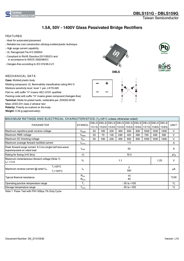 Taiwan Semiconductor DBLS157G Prostownik mostkowy DBLS 1.000 V taśma na dużej rolce