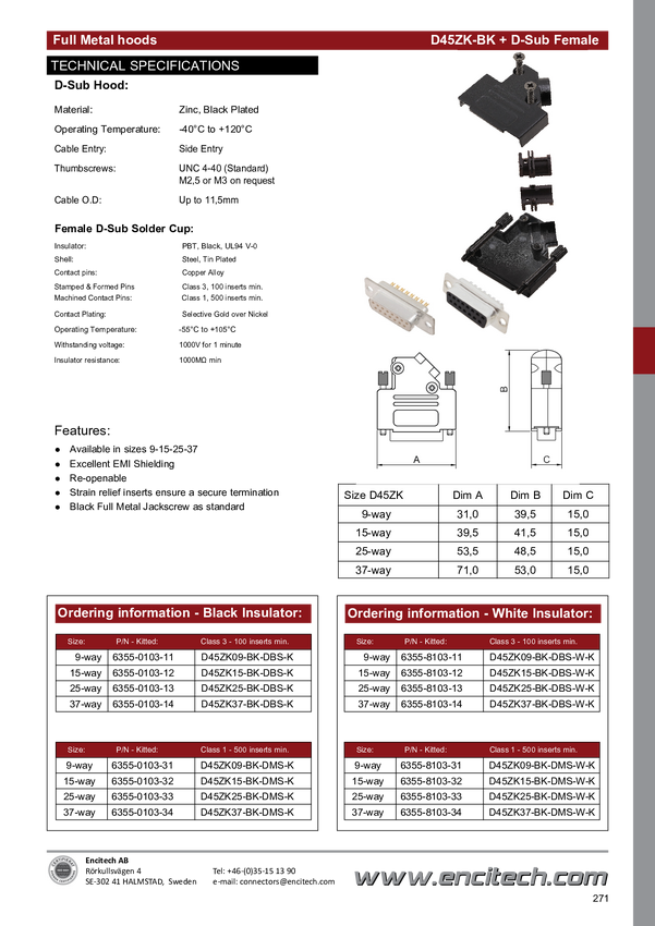 encitech D45ZK09-BK-DBS-W-K 6355-8103-11 Zestaw listew żeńskich D-Sub 45 ° Ilość styków: 9 kielich lutowniczy 1 szt.