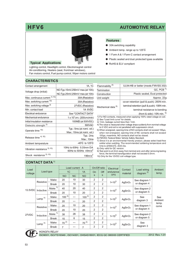 Przekaźnik; elektromagnetyczny; samochodowy; HFV6/024-ZST; 24V; 10A/20A; SPDT 1 styk przełączny; konektory; do gniazda; HONGFA; = FRC7C-S-DC24V; RoHS