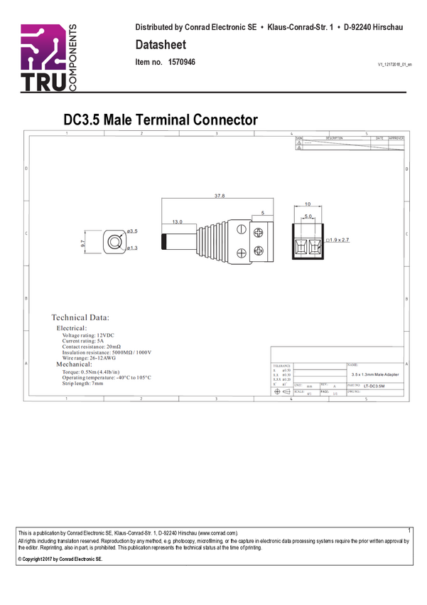 Złącze męskie niskonapięciowe TRU COMPONENTS LT-DC3.5M złącze męskie proste 3.5 mm 1.3 mm 1 szt.