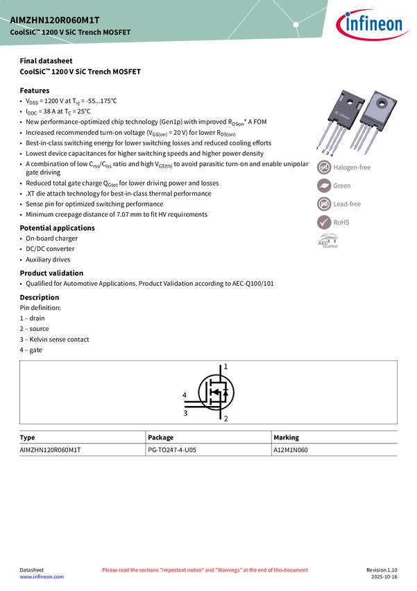 CoolSiC™ Automotive MOSFET 1200V G1p in TO247-4L package With Infineon’s performance optimized chip technology (Gen1p), the SiC MOSFET features best-in-class switching performance, robustness against parasitic turn-ons, as well as improved RDSon and Rth(j-c). High power density, superior efficiency, bi-directional charging capabilities and significant reductions in system costs making it an ideal choice for on-board charger and DCDC applications.
