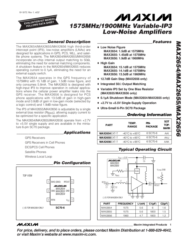 MAX2656 LNA for DCS/PCS Applications with Adjustable-IP3 and Gain-Step