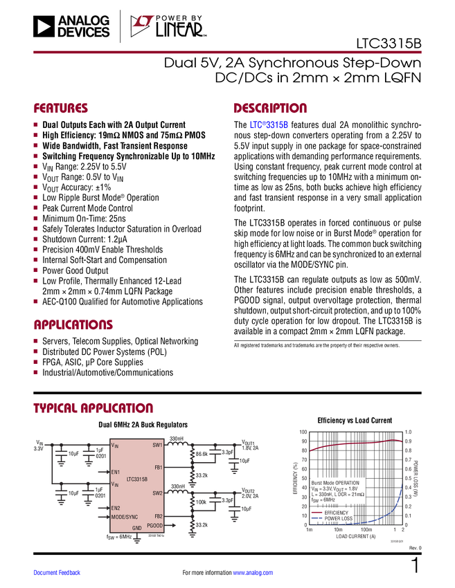 Dual 5V, 2A Synchronous Step-Down DC/DCs in 2mm × 2mm LQFN