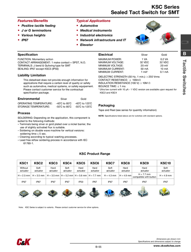 Mikroprzycisk; KSC441J DCT 70SH LFS; TACT; 6,2x6,2x5,2mm; SPDT NC + NO; SMD; 4 pin; 50mA; 32V DC; 0,6mm; KSC441JDCT70SHLFS; C&K; RoHS; opakowanie/100szt