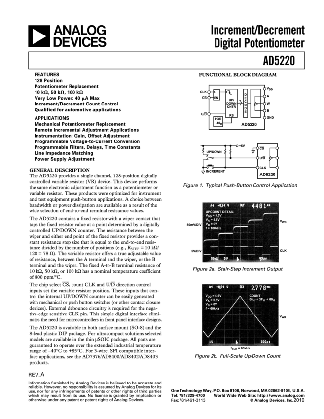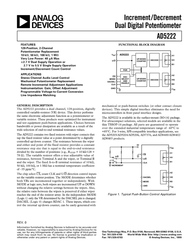 AD5222: Dual, Increment/Decrement Digital Potentiometer
