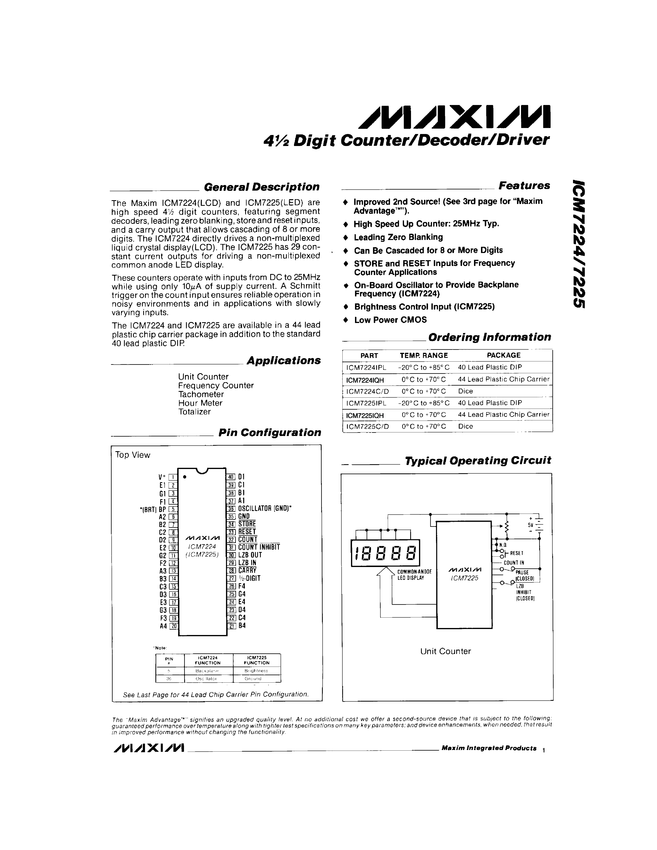ICM7224, ICM7225 4 1/2 Digit, LCD, High-Speed Counter Decoder Driver