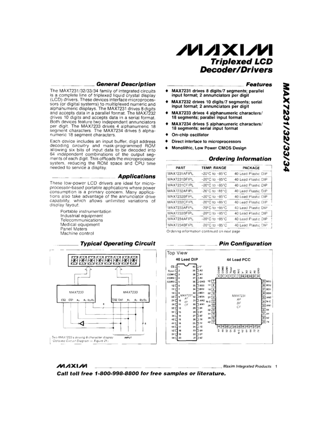 MAX7231, MAX7231C, MAX7232, MAX7233, MAX7234 8-Digit, Triplexed LCD Decoder Driver