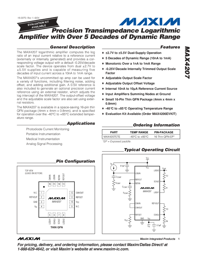 MAX4207 Precision Transimpedance Logarithmic Amplifier with Over 5 Decades of Dynamic Range