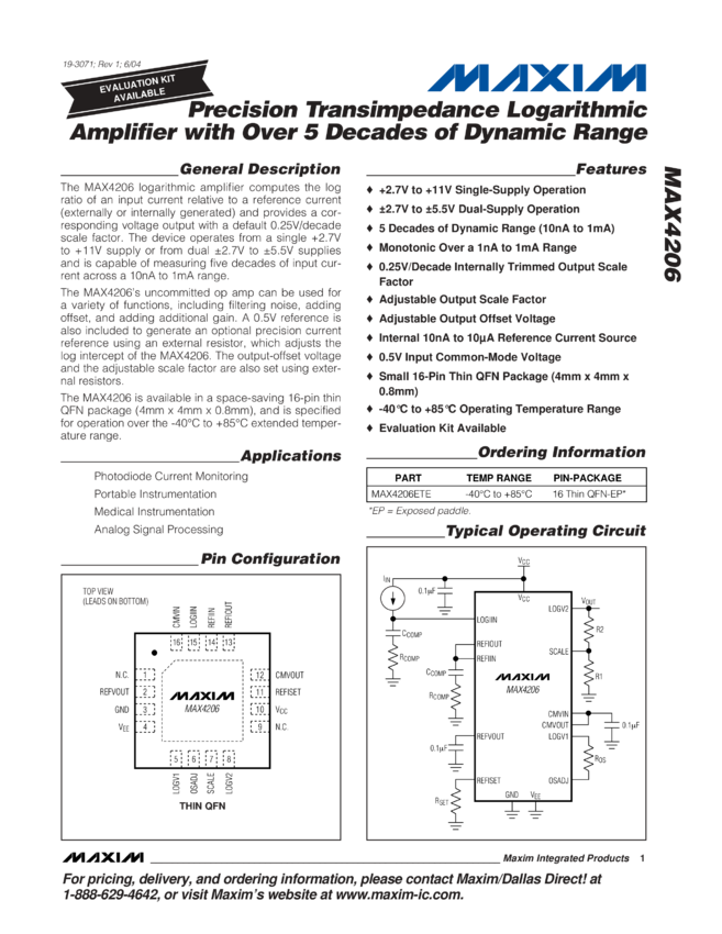 MAX4206 Precision Transimpedance Logarithmic Amplifier with Over 5 Decades of Dynamic Range