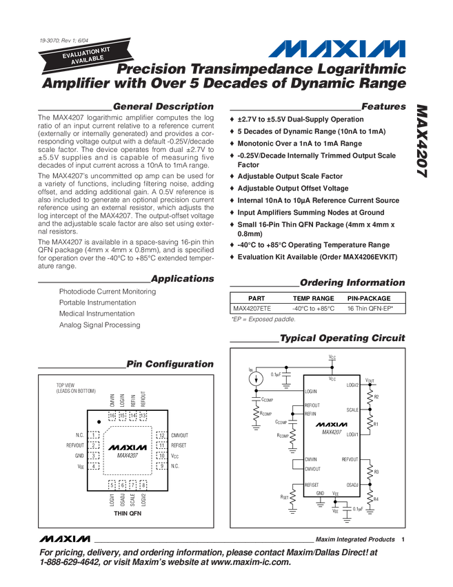 MAX4206 Precision Transimpedance Logarithmic Amplifier with Over 5 Decades of Dynamic Range
