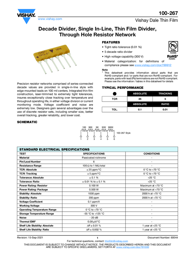 Decade Divider, Single In-Line, Thin Film Divider, Through Hole Resistor Network