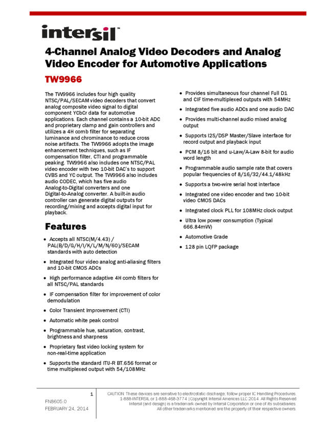 4-Channel Analog Video Decoders and Analog Video Encoder for Automotive Applications