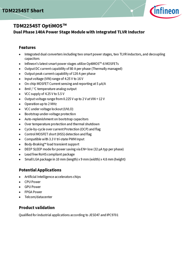 OptiMOS™ Dual-phase TLVR power module 140 A TDM22545T OptiMOS™ Dual-phase TLVR power module co-packages two smart power stages and two TLVR power inductors to implement two independent synchronous buck converters into a small 10x9x4.8 mm package. The TLVR inductor reduces the size of the onboard decoupling capacitors and provides much faster transient response during large load current transitions.