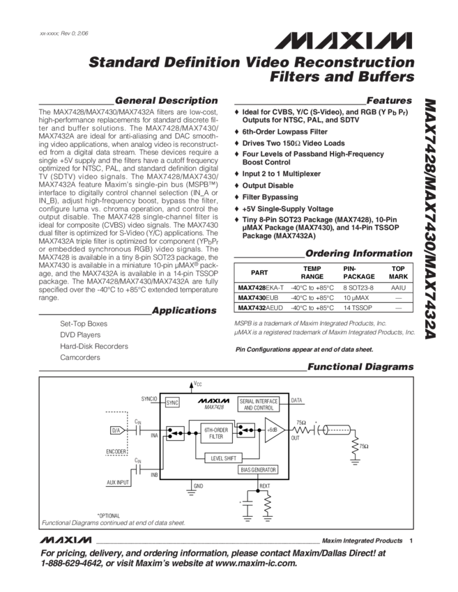 MAX7432 3-Channel Standard Definition (SD) Video Reconstruction Filter and Buffer with 2:1 Input Mux