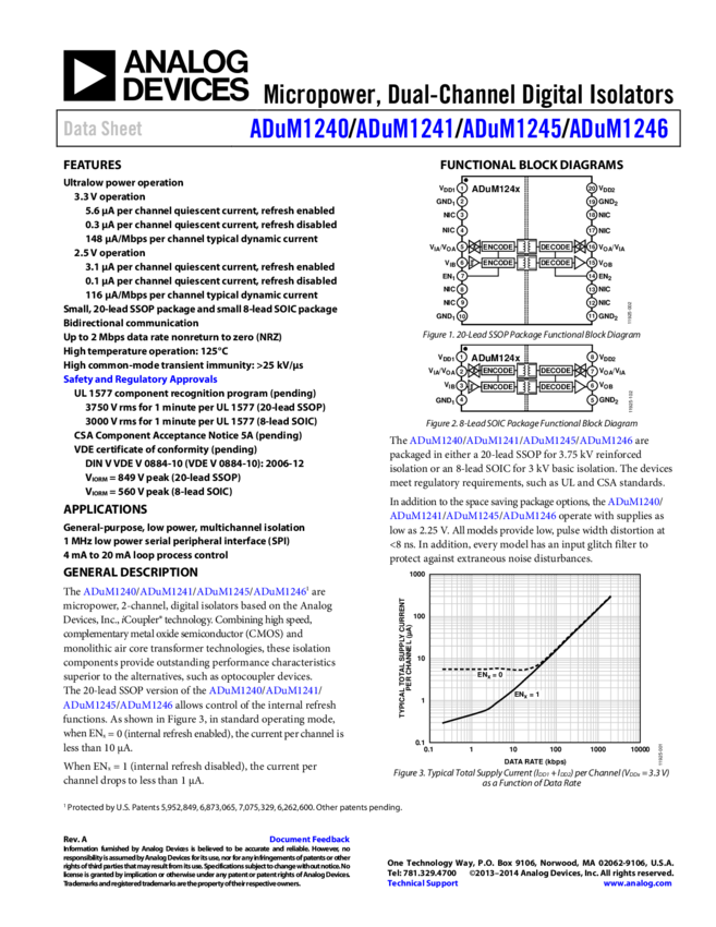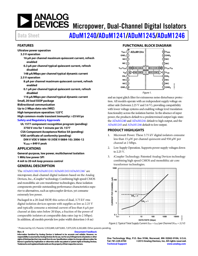 ADUM1246: Micropower, Dual-Channel Digital Isolators, Default High (1/1 Channel Directionality)