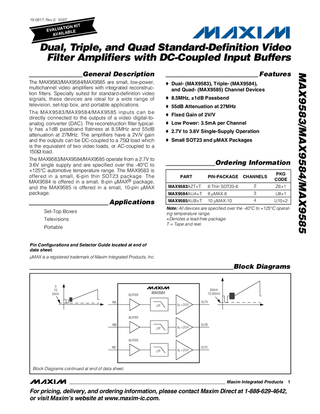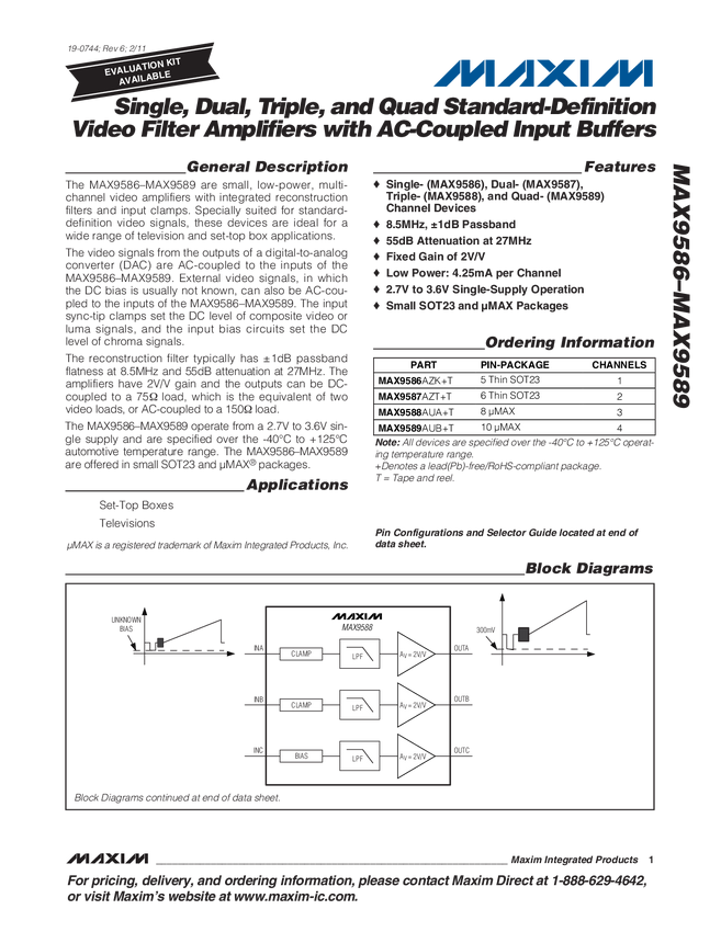 Dual, Triple, and Quad Standard-Definition Video Filter Amplifiers with DC-Coupled Input Buffers