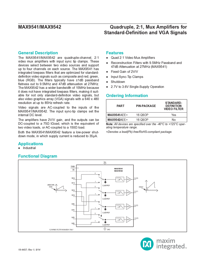 MAX9541, MAX9542 Quadruple, 2:1, Mux Amplifiers for Standard Definition and VGA Signals