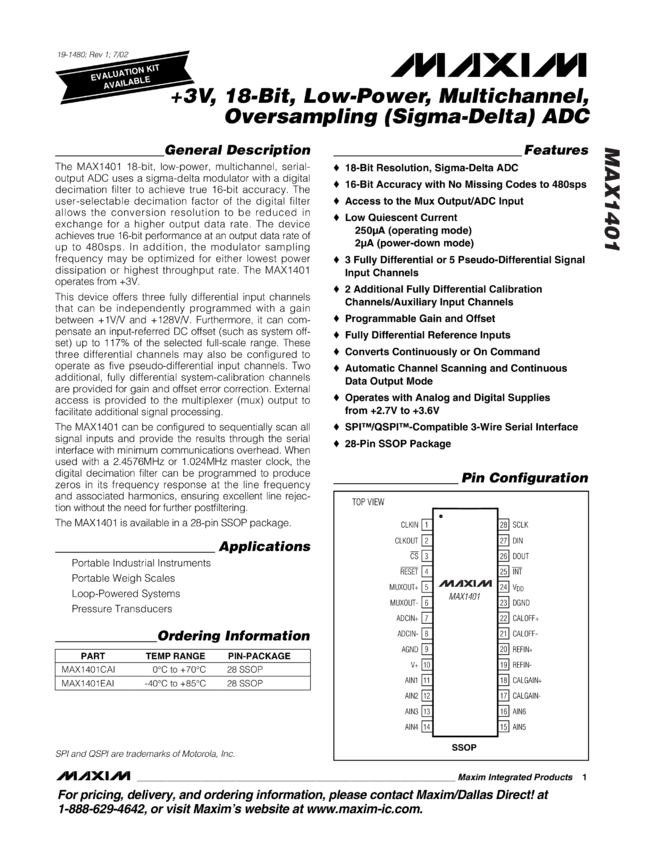 MAX1401 +3V, 18-Bit, Low-Power, Multichannel, Oversampling (Sigma-Delta) ADC