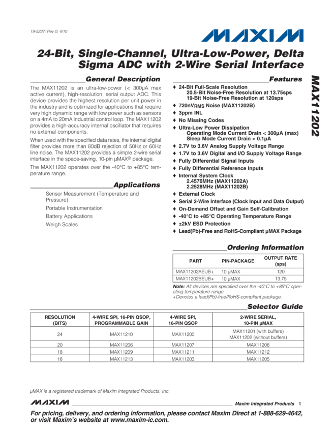 MAX11202 24-Bit, Single-Channel, Ultra-Low-Power, Delta-Sigma ADC with 2-Wire Serial Interface