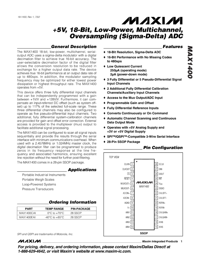 MAX1400 +5V 18-Bit Low-Power Multichannel Oversampling (Sigma-Delta) ADC