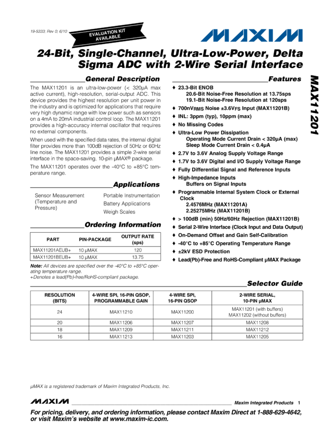 MAX11201 24-Bit, Single-Channel, Ultra-Low-Power, Delta Sigma ADC with 2-Wire Serial Interface