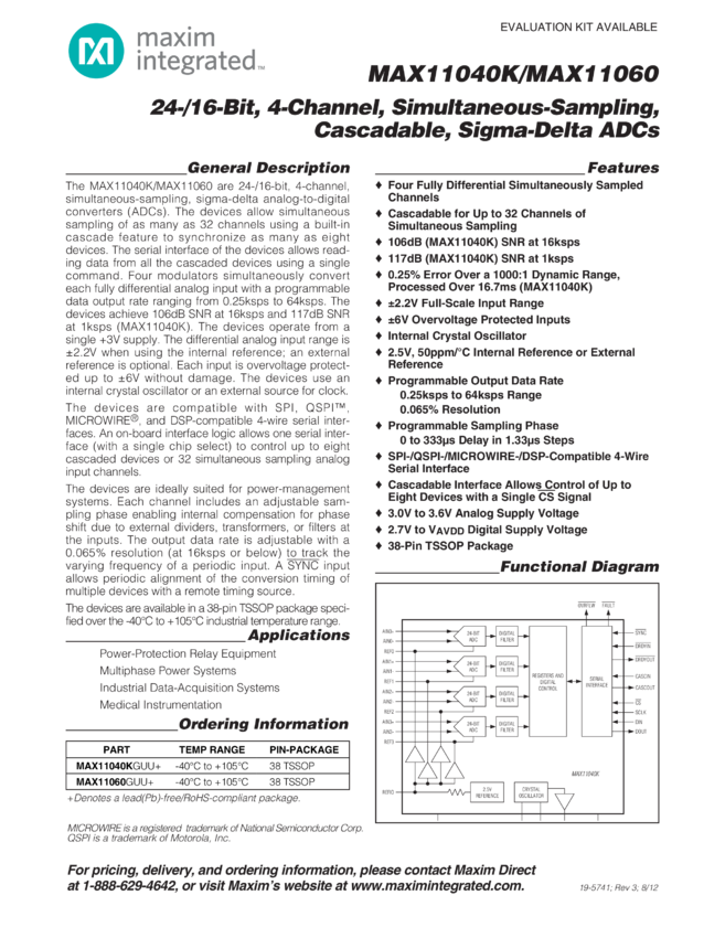 MAX11040K, MAX11060 24-/16-Bit, 4-Channel, Simultaneous-Sampling, Cascadable, Sigma-Delta ADCs