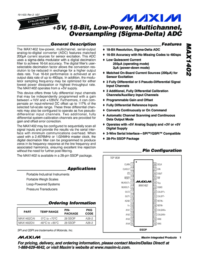 MAX1402 +5V, 18-Bit, Low-Power, Multichannel, Oversampling (Sigma-Delta) ADC