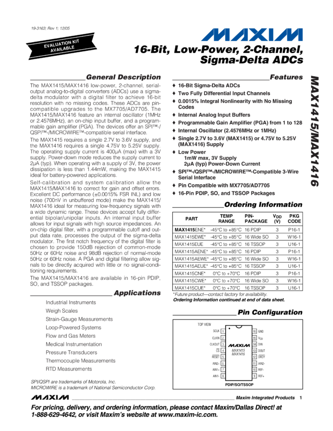 MAX1415, MAX1416 16-Bit, Low-Power, 2-Channel, Sigma-Delta ADCs