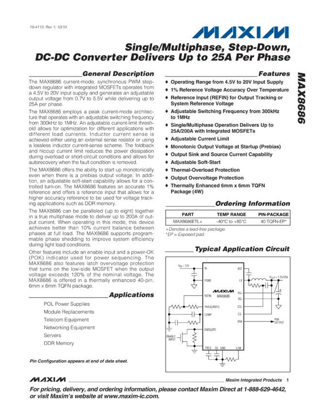 MAX8686 Single/Multiphase, Step-Down, DC-DC Converter Delivers Up to 25A Per Phase