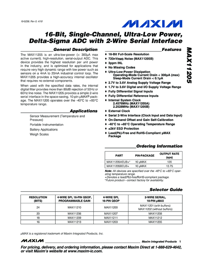 MAX11205 16-Bit, Single-Channel, Ultra-Low Power, Delta-Sigma ADC with 2-Wire Serial Interface