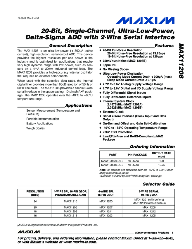 MAX11208 20-Bit, Single-Channel, Ultra-Low-Power, Delta-Sigma ADC with 2-Wire Serial Interface