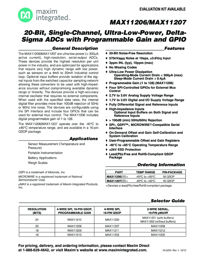 MAX11206, MAX11207 20-Bit, Single-Channel, Ultra-Low-Power, Delta-Sigma ADCs with Programmable Gain and GPIO
