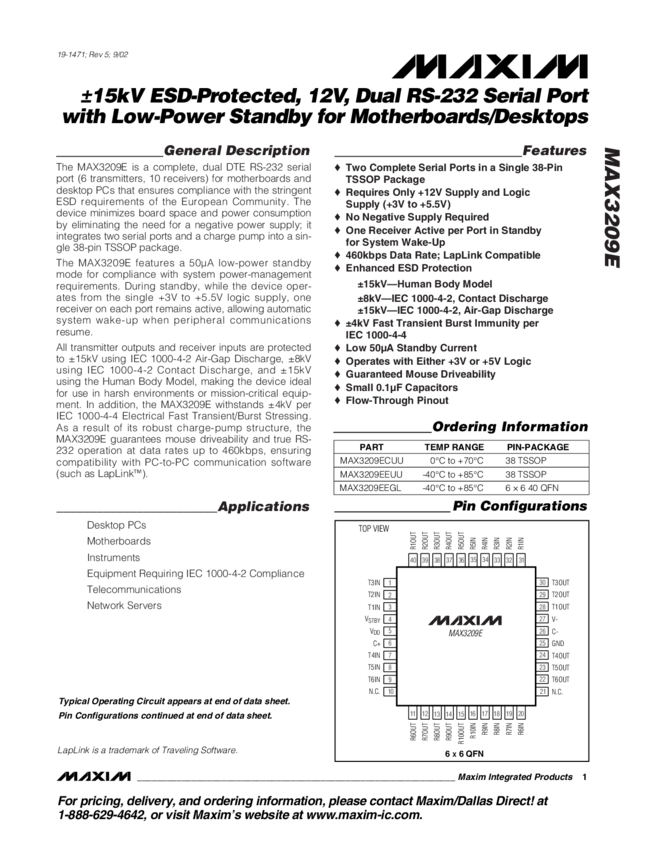 MAX3209E &#17715kV ESD Protected, 12V, Dual RS-232 Serial Port with Low Power Standby for Motherboards Desktops