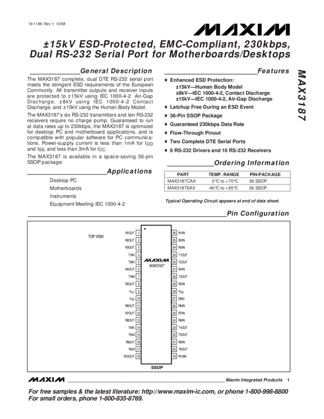 MAX3187 &#17715kV ESD-Protected, EMC-Compliant, 230kbps Dual RS-232 Serial Port for Motherboards/Desktops