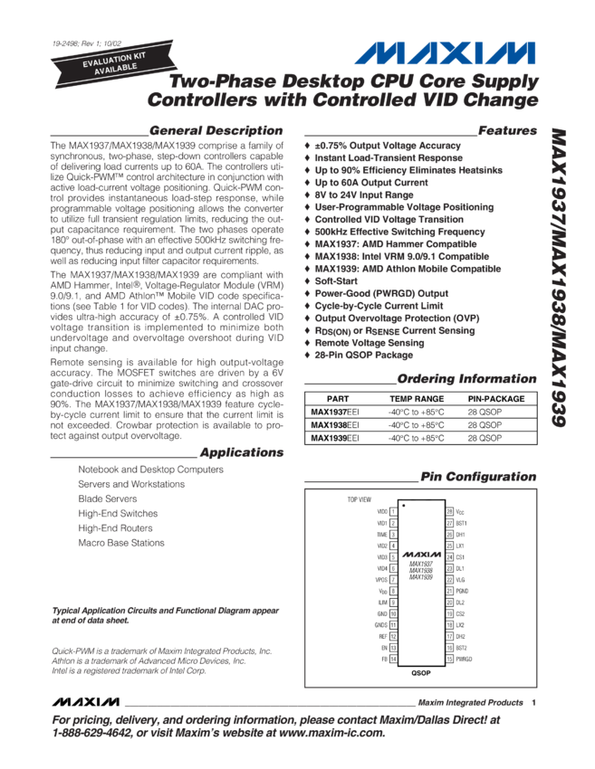 MAX1937, MAX1938, MAX1939 Two-Phase Desktop CPU Core Supply Controllers with Controlled VID Change