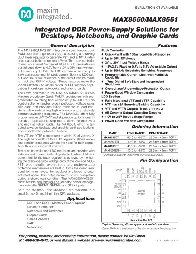 MAX8550, MAX8551 Integrated DDR Power-Supply Solutions for Desktops, Notebooks, and Graphic Cards