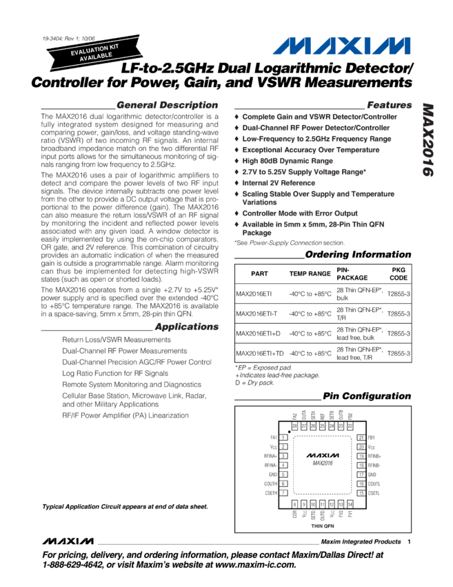 MAX2016 LF-to-2.5GHz Dual Logarithmic Detector/Controller for Power, Gain, and VSWR Measurements