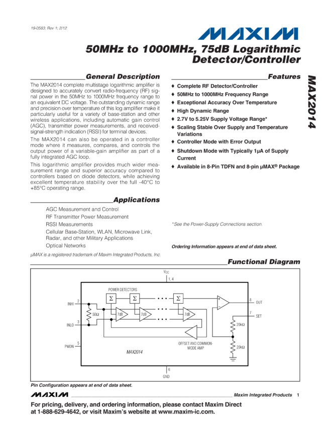MAX2014 50MHz to 1000MHz, 75dB Logarithmic Detector/Controller