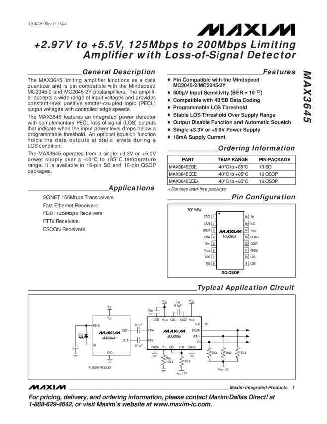 MAX3645 +2.97V to +5.5V, 125Mbps to 200Mbps Limiting Amplifier with Loss-of-Signal Detector